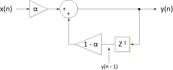 $$ y(n)= \alpha x(n) + (1-\alpha)y(n-1) \qquad (1) $$