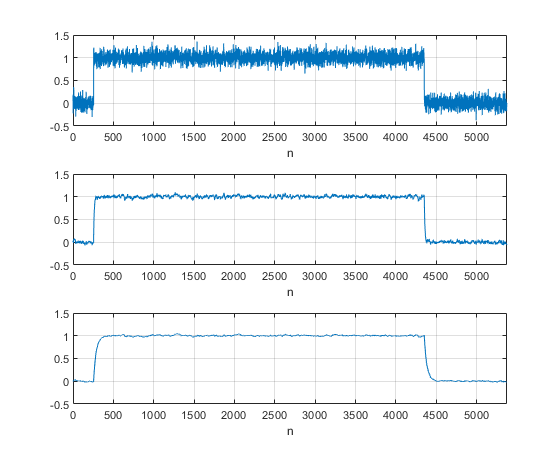 The noisy pulse is shown in the top plot of Figure 4, and the filtered pulse is shown in the middle plot. The filter has attenuated the noise with minimal distortion to the pulse, because the significant portion of the filter’s impulse response is less than 30 samples long (Figure 2), which is much shorter than the pulse length. If we change α to 1/32, the noise is attenuated further, as shown in the bottom plot. We can also see some distortion on the edges of the pulse due to the filter.