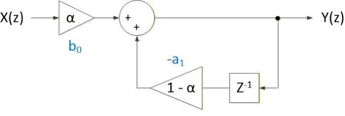 Figure 5 shows a first-order IIR filter with the conventional notation [3,4] for the coefficients: the feed-forward coefficient is b0 = α and the feed-back coefficient is -a1 = 1-α. The transfer function in z is given by: