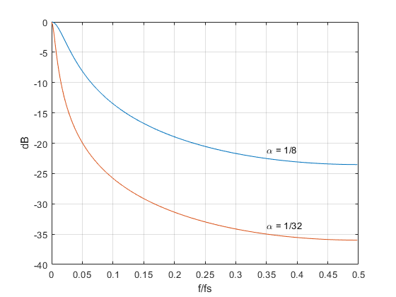 Let’s compute the impulse response of the filter for α = 1/8.The following Matlab code implements Equation 1 for an impulse input: